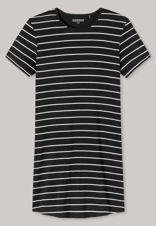 Dieses kurzärmelige, schwarze Nachthemd ist genau das Richtige für entspannte Nächte! Weicher Single Jersey aus Baumwolle und Modal sorgt dabei für hohen Tragekomfort und bekommt mit den weißen Ringeln einen modischen Look. Ein pfirsichfarben abgesetzter Rundhals-Rand und der abgerundete Saum setzen charmante Details. Ein bequemes Lieblingsstück in bester SCHIESSER-Qualität!