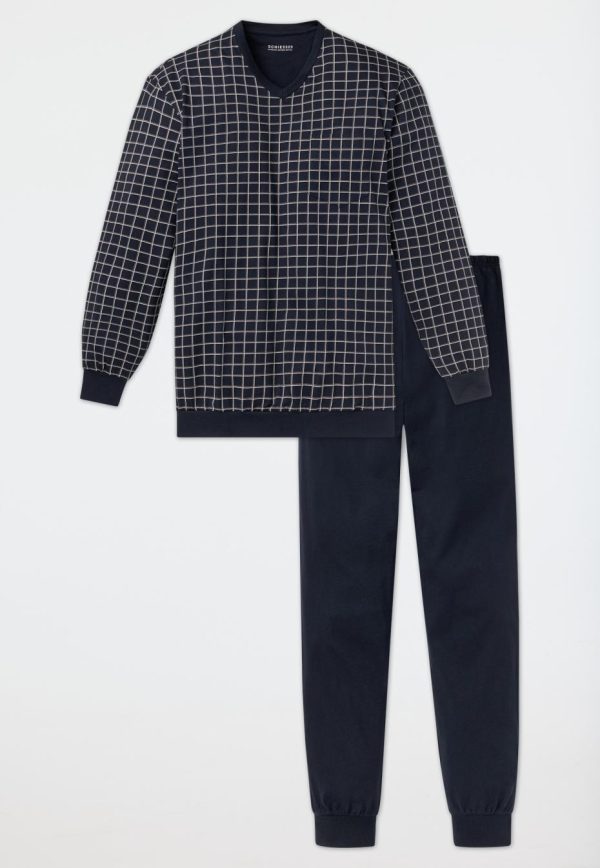 Hoher Tragekomfort steht ganz im Fokus dieses langen, dunkelblauen Schlafanzugs für Herren. Feiner Jersey aus 100% Baumwolle fühlt sich dabei angenehm weich an und wird mit den Bündchenabschlüssen stimmig abgerundet. Und auch optisch kann der Zweiteiler punkten: Weiß-blaue Karos schenken dem Oberteil einen maskulinen Charakter und bekommen mit der aufgesetzten Brusttasche ein feines Details. Genau das Richtige für Herren, die auch nachts nicht auf beste SCHIESSER-Qualität verzichten möchten!