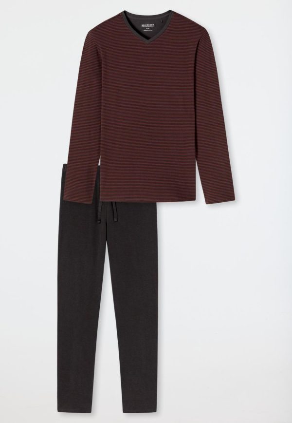 - langer Herren-Schlafanzug mit geringeltem Langarmshirt in Terracotta und Anthrazit